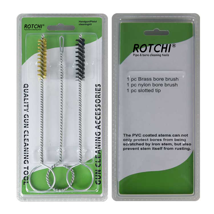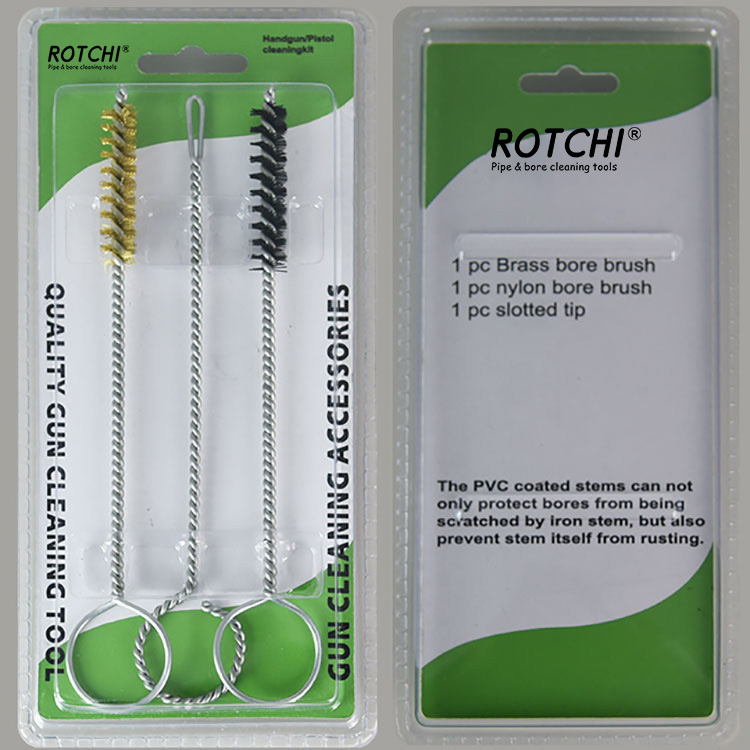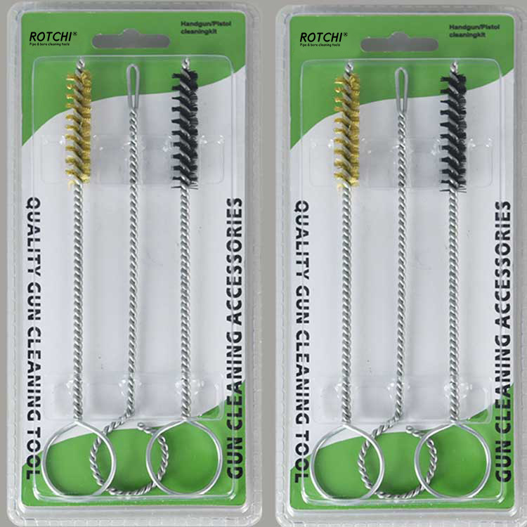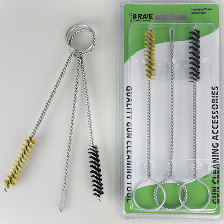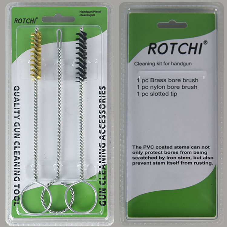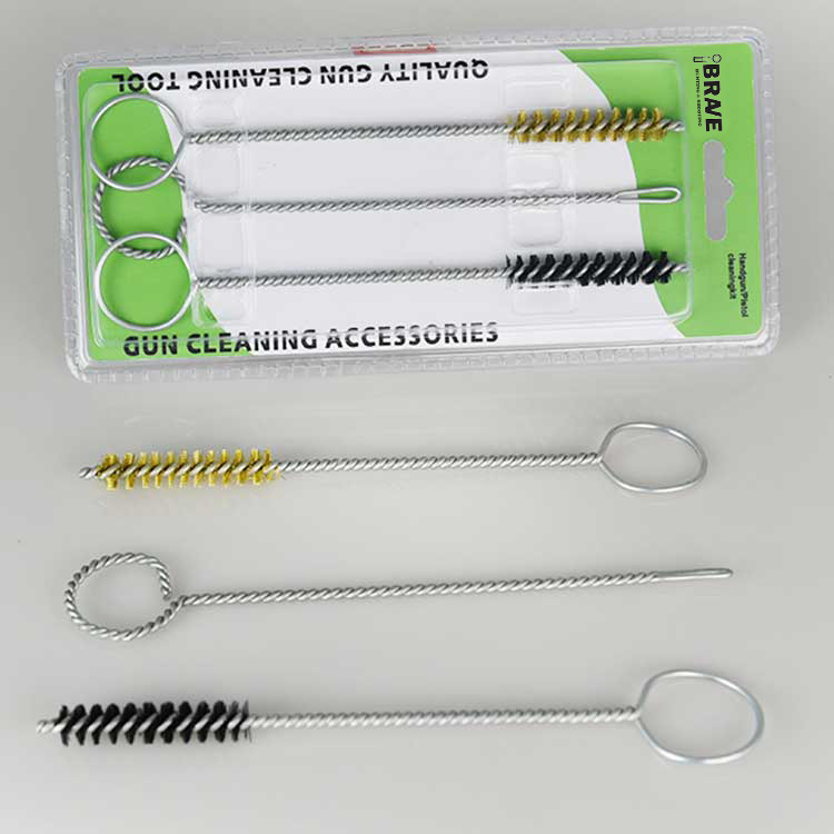3 PCS Sethandgun Cleaing Kit, nakaimpake sa Double Blister. Isang tanso na naglilinis ng brush, isang naylon na nagbigay ng paglilinis ng brush at isang slotted patch holder. Madaling gamiting at epektibo.