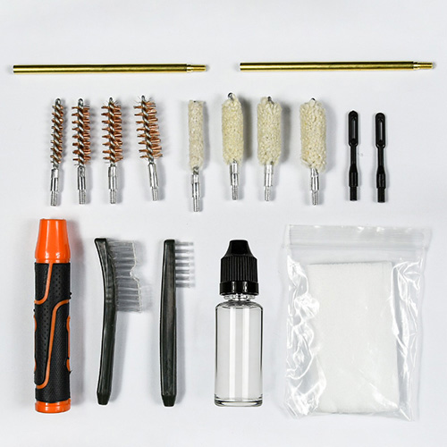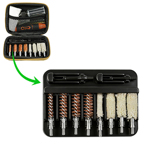Ang handgun cleaning kit ay may kasamang 4 na laki (.22, 9mm, .40, .45cal.). Pinahiran ng telang OX PVC case na may zip. Mga brass na brush at cotton mops, 2 rod. Mga buhangin at itim kulay para sa mga pagpipilian.
